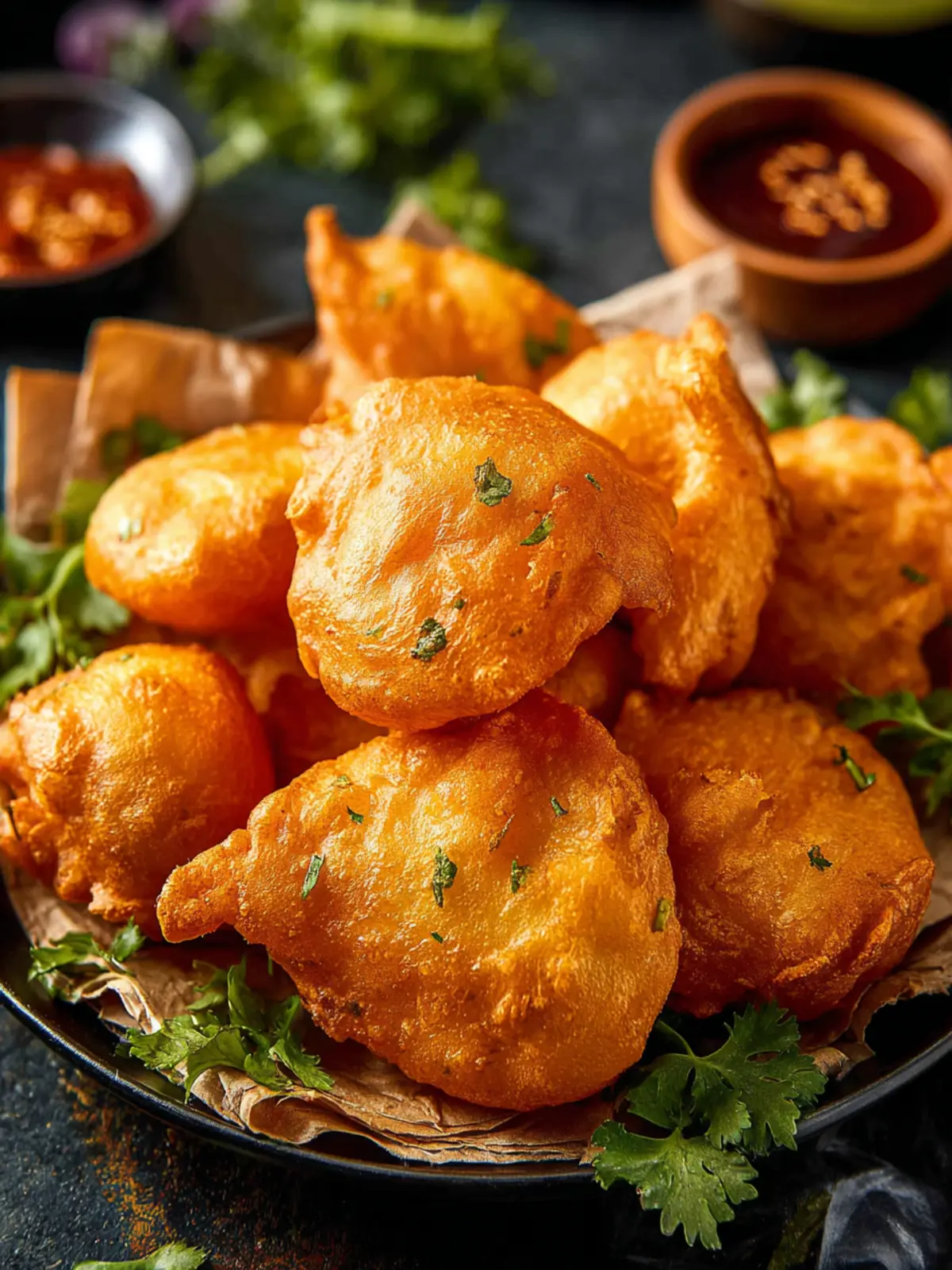 Deliciously crispy and golden brown potato fritters made with chickpea flour and spices.