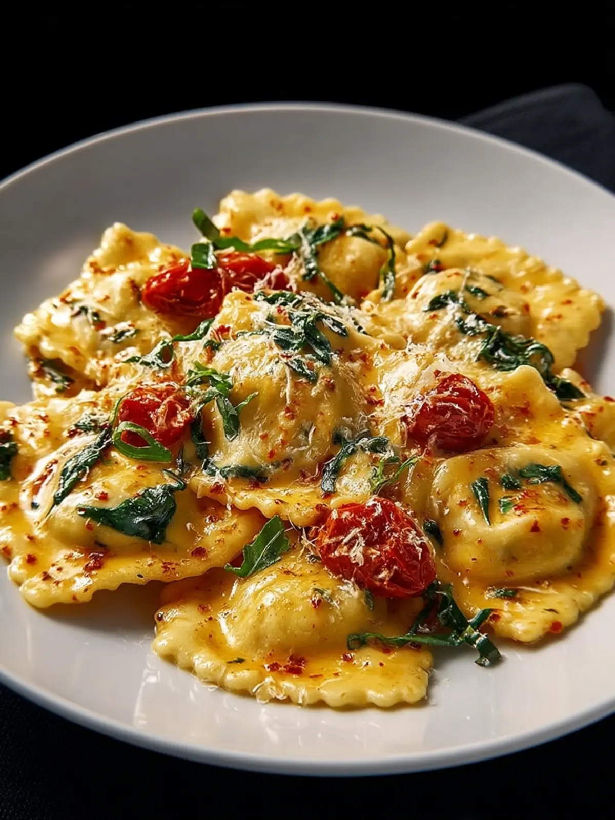 - Gently add cooked ravioli to the skillet. Toss with sauce to coat. Top with roasted tomatoes and red pepper flakes.