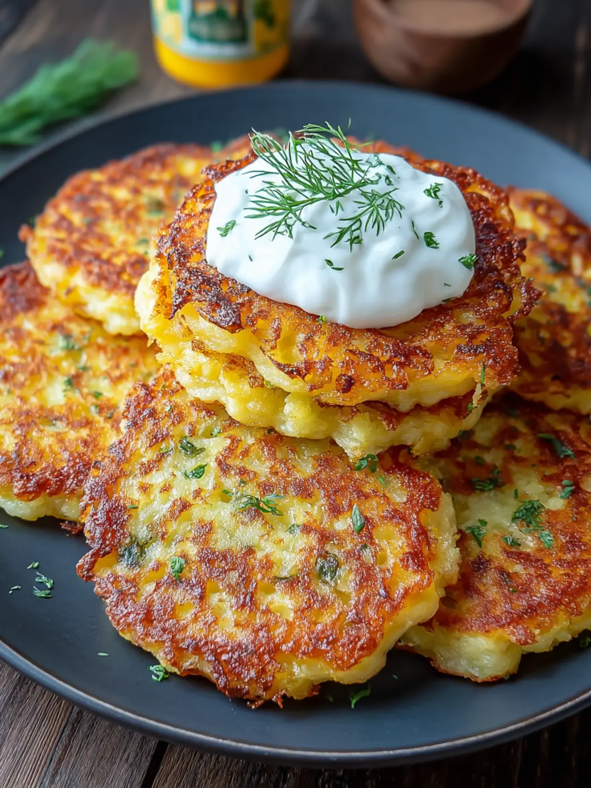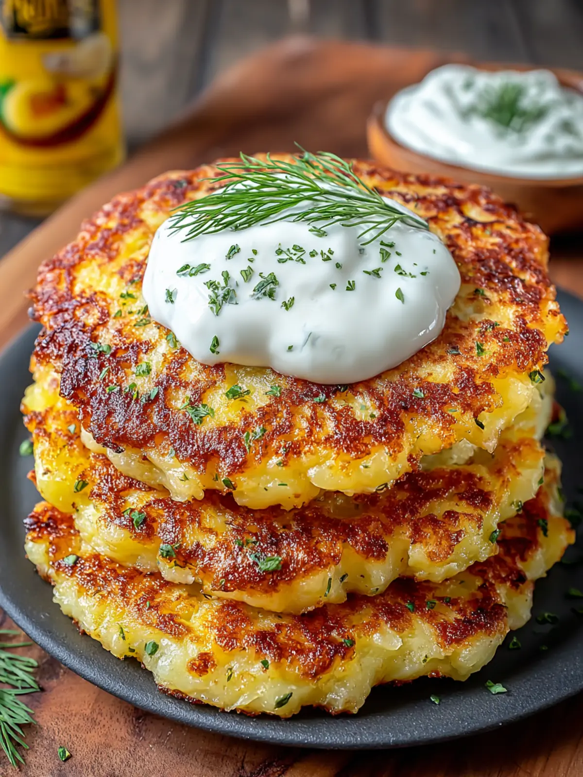Delicious crispy potato pancakes made with grated potatoes, onion, and fresh dill, served with sour cream.