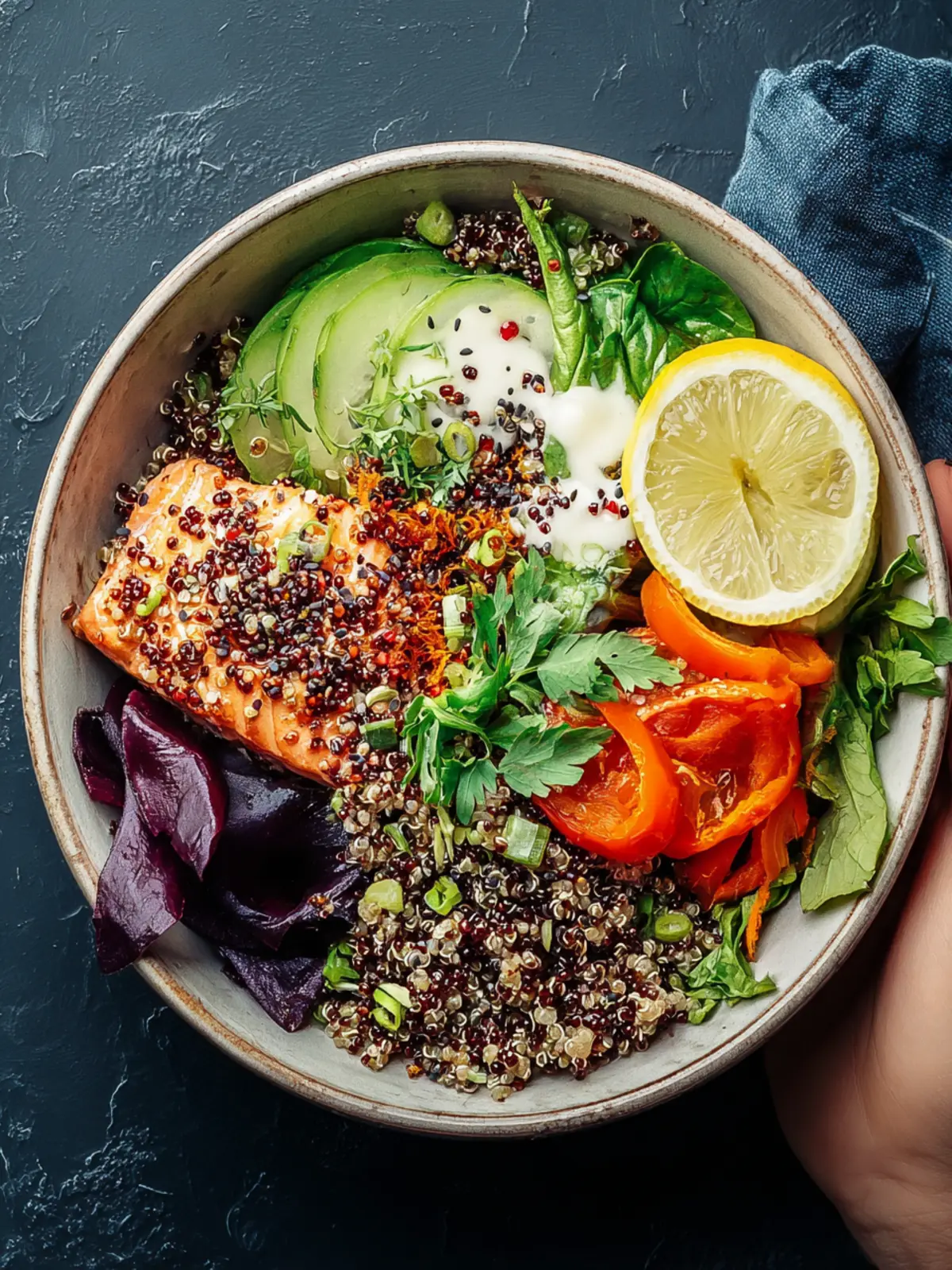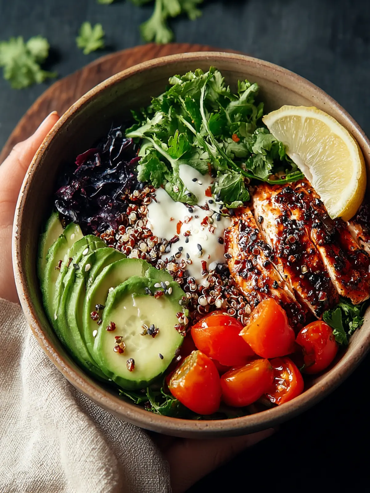 - Assemble the bowl: Start with quinoa as the base and layer spinach, chickpeas, tomatoes, avocado, and protein on top. Drizzle with lemon juice and olive oil.