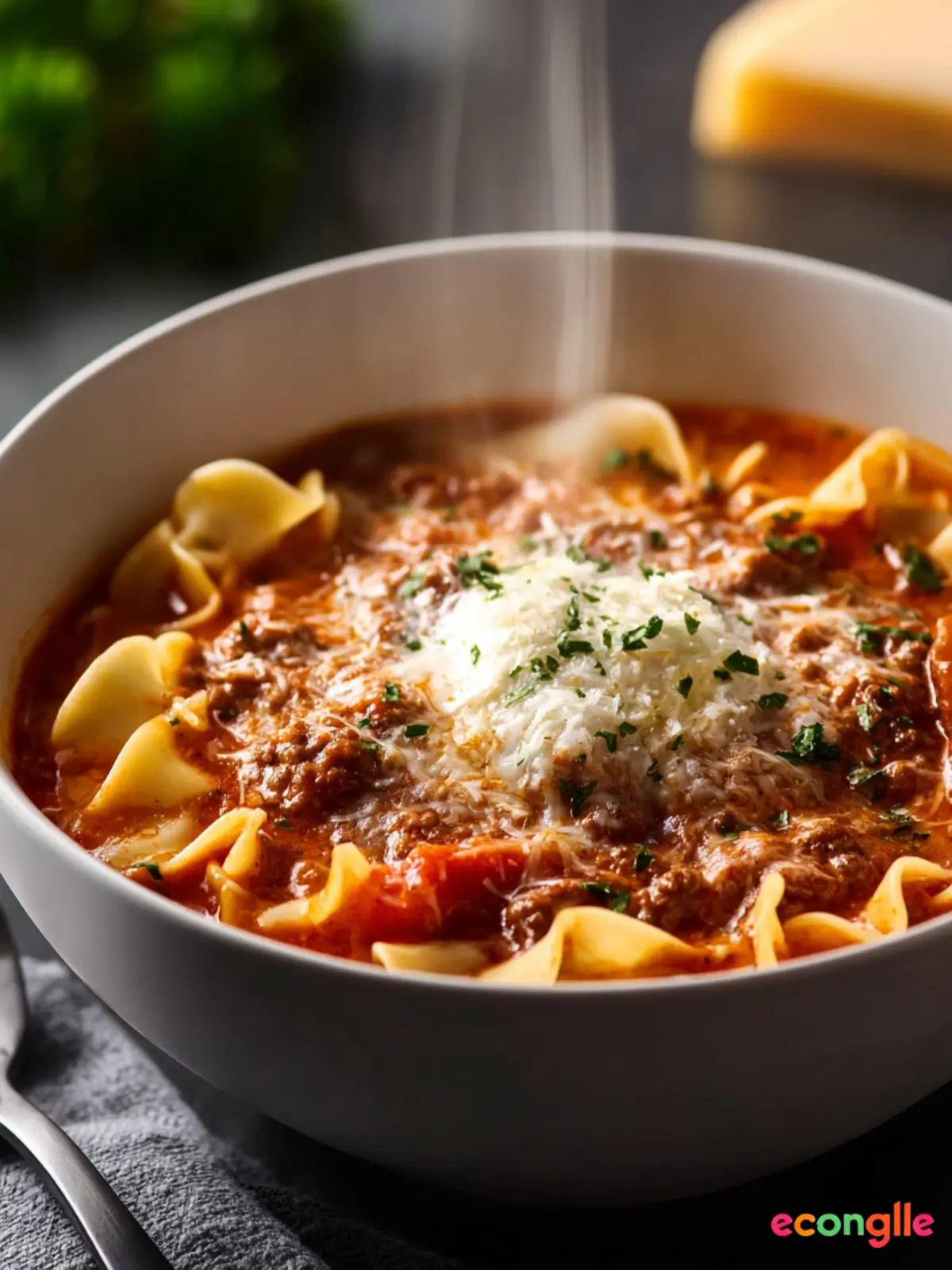 A comforting and delicious soup made with ground beef, noodles, and cheese.