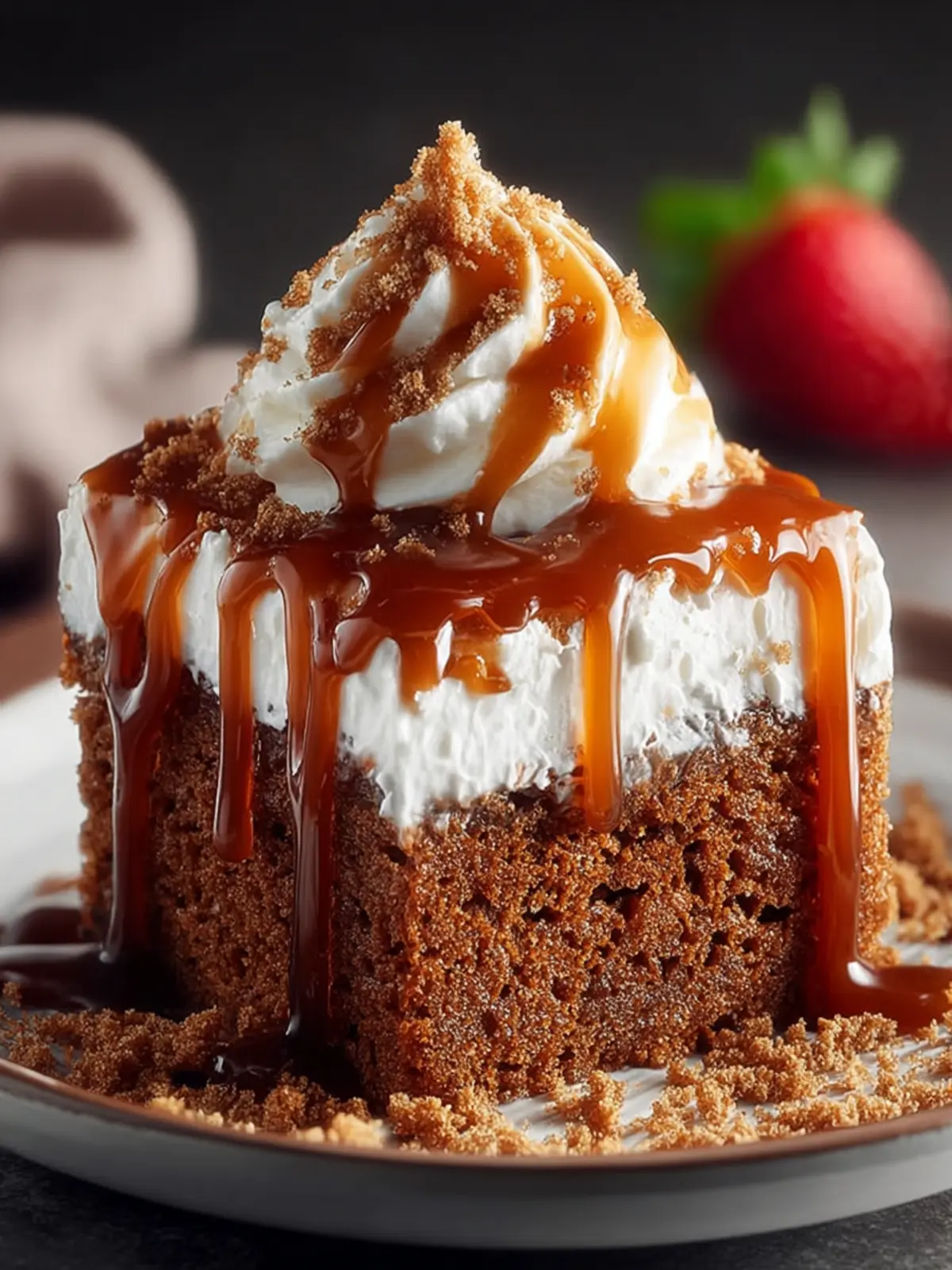Consider your toppings carefully. Whipped cream or cream cheese frosting pairs beautifully with the spices in your gingerbread poke cake. Feel free to add a sprinkle of crushed gingersnap cookies or chopped nuts for texture.