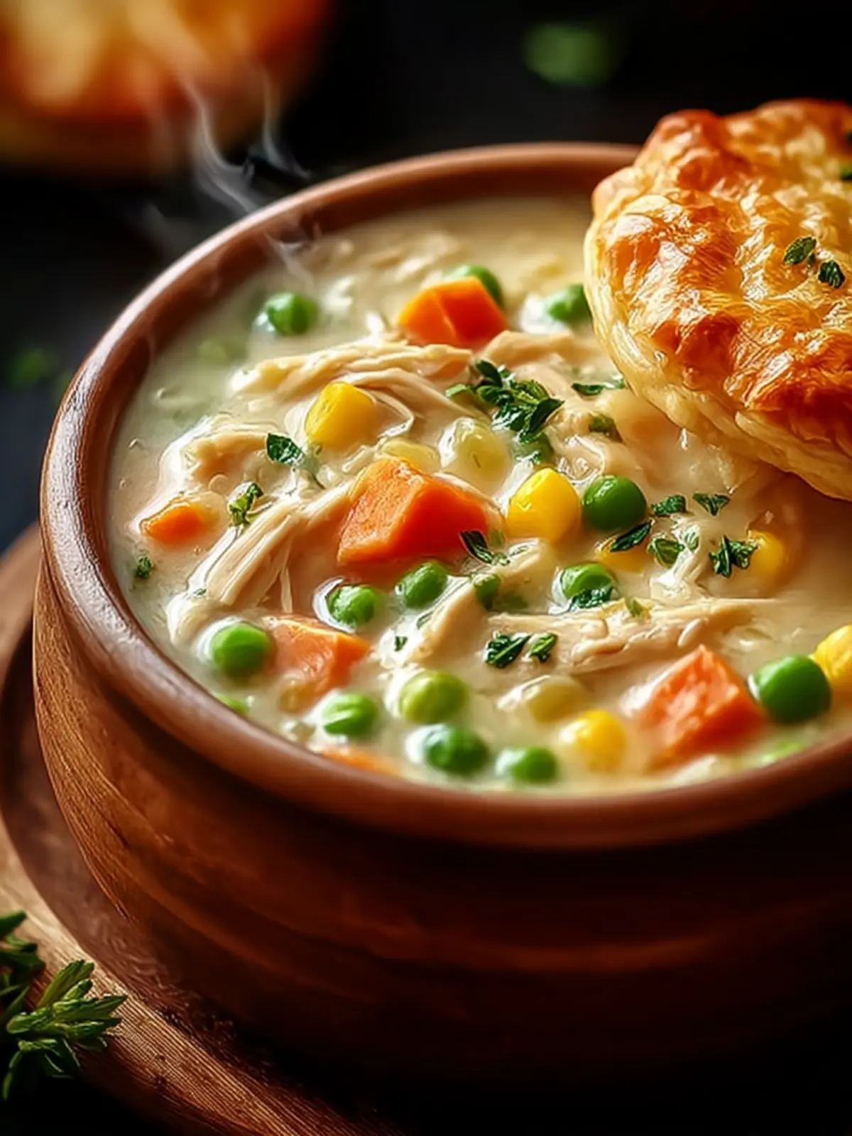 This creamy chicken soup is hearty and topped with delicious biscuit pieces, perfect for a comforting meal.