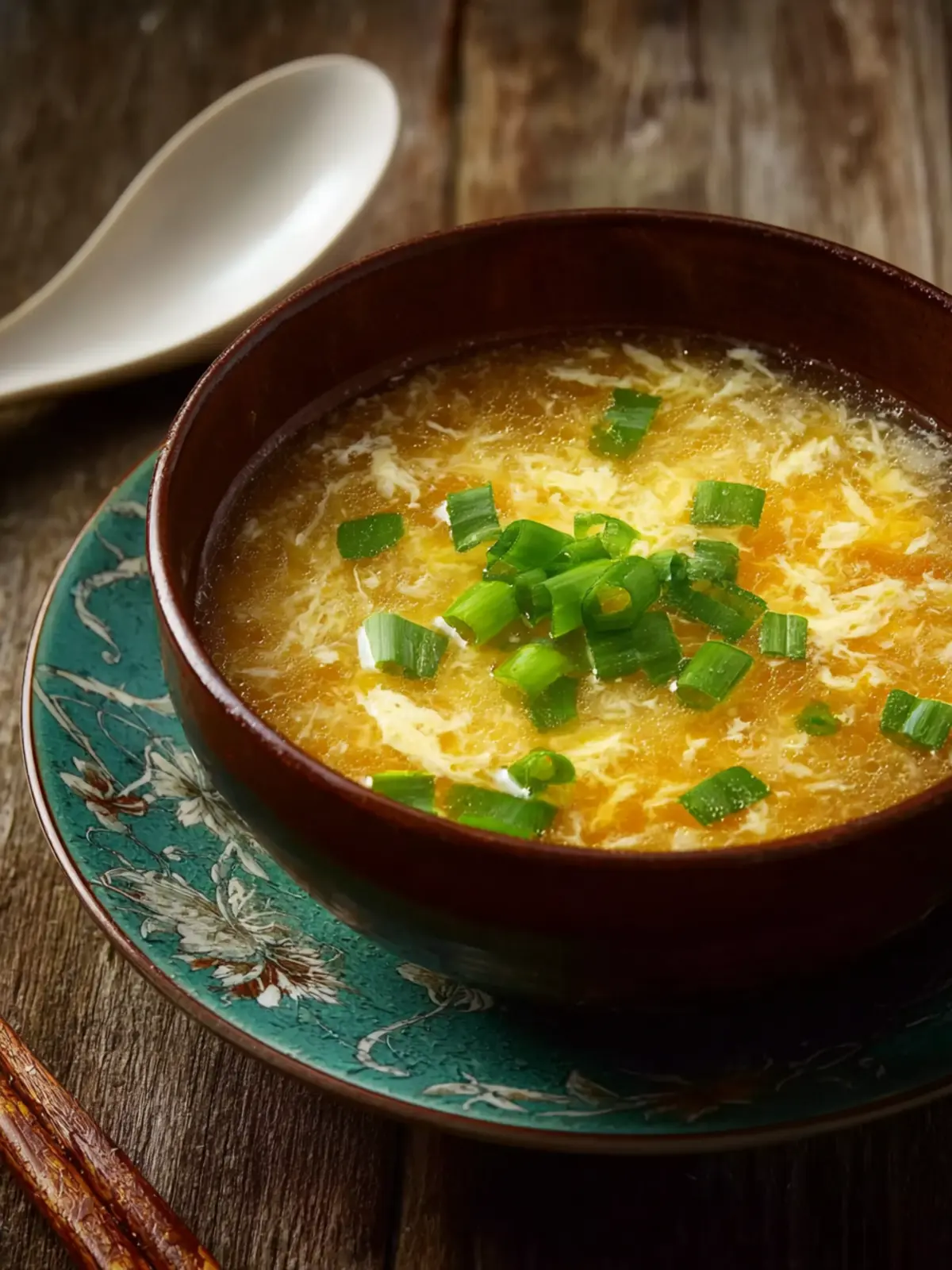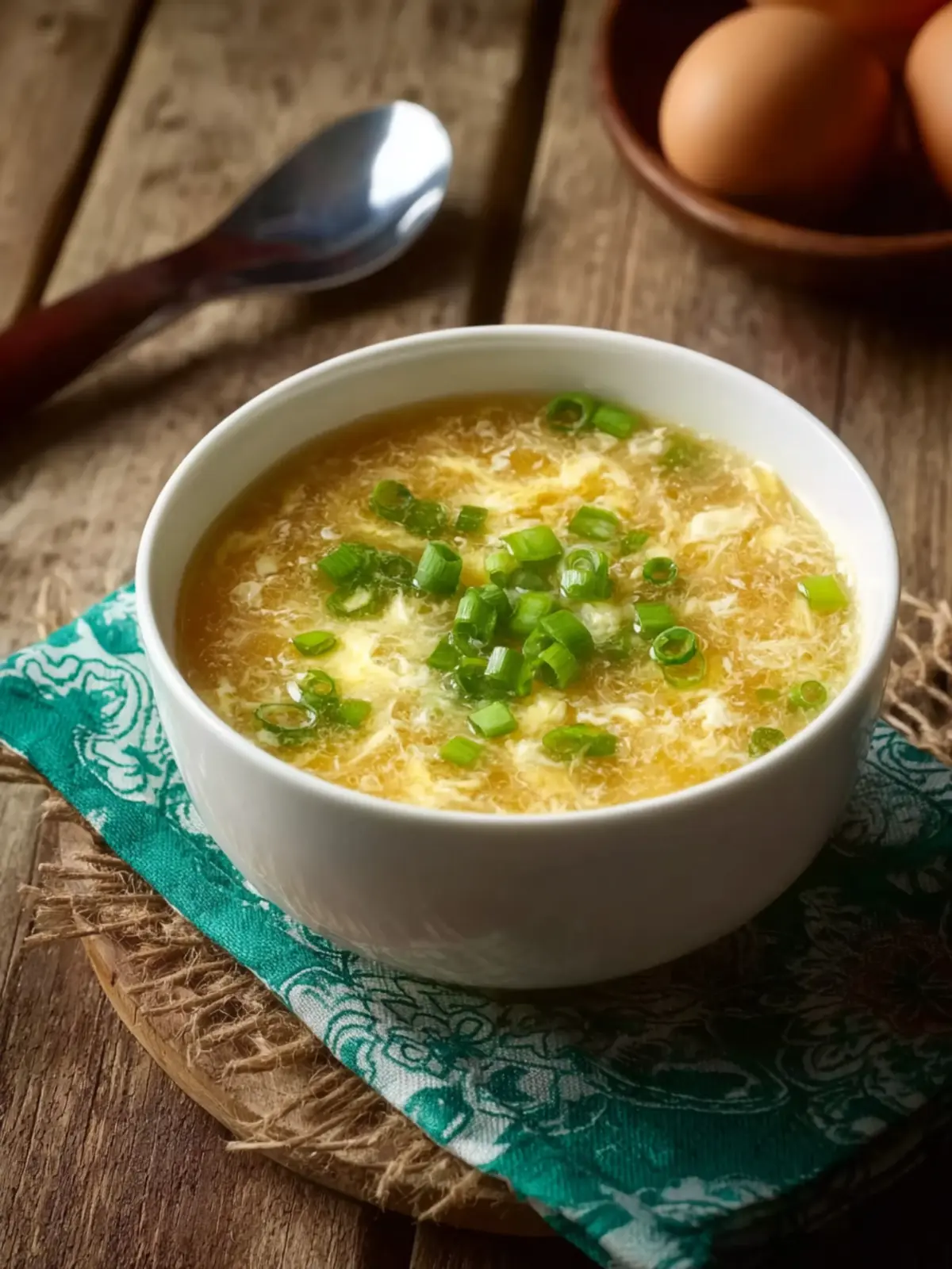 - Create the egg ribbons: Lightly beat the eggs in a bowl. Reduce the heat so the broth is gently simmering. Using a fork or whisk, slowly drizzle the eggs into the soup while stirring the broth in a circular motion. You’ll see delicate ribbons form instantly — soft, silky strands floating beautifully in the golden broth.