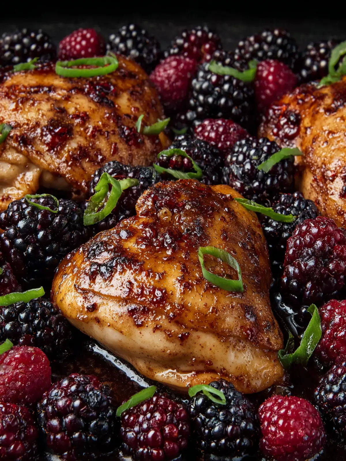 This dish features succulent chicken thighs coated in a sweet and spicy blackberry glaze, perfect for a delightful dinner.