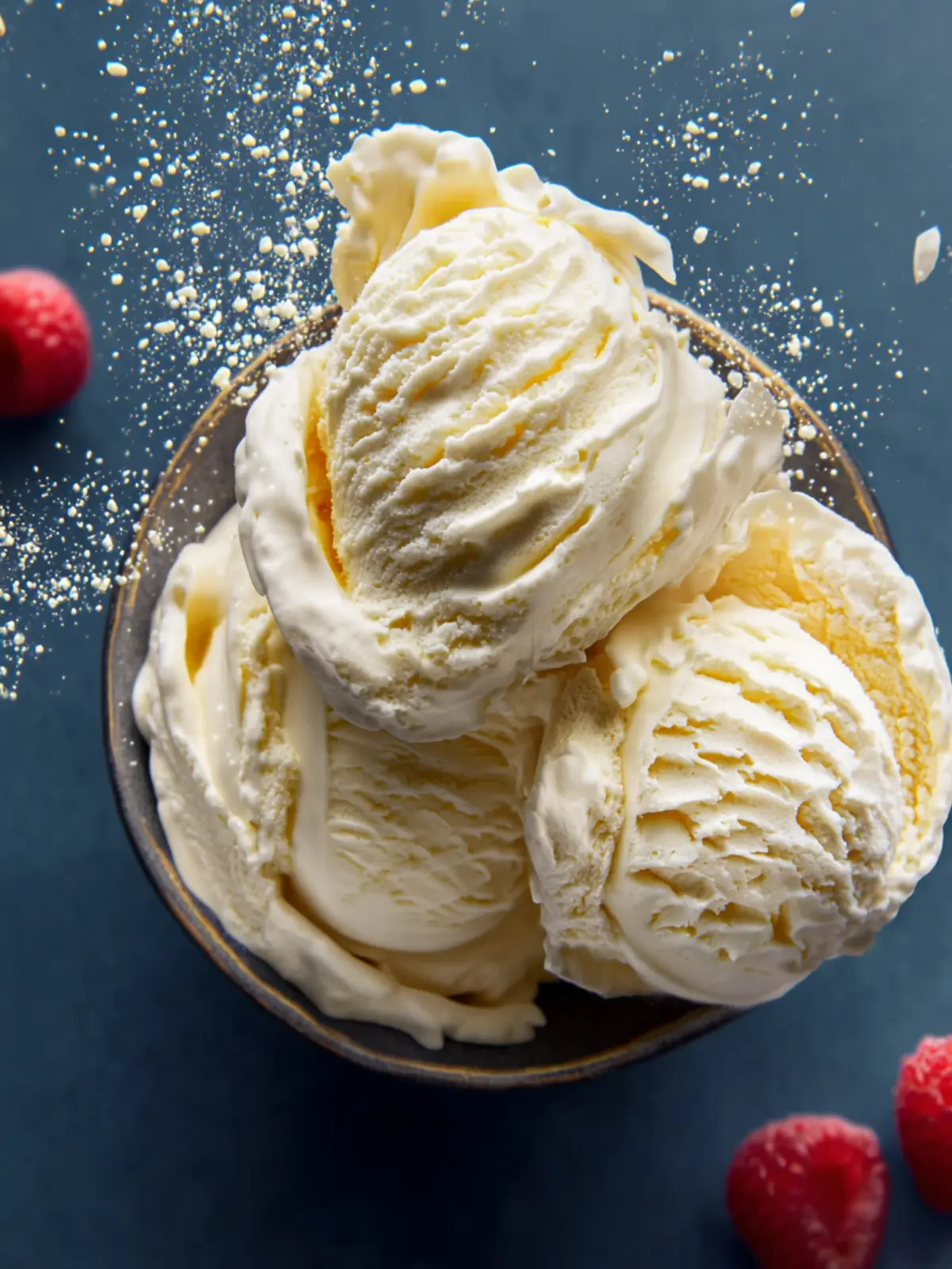 A delicious keto-friendly vanilla ice cream made with heavy cream and erythritol.