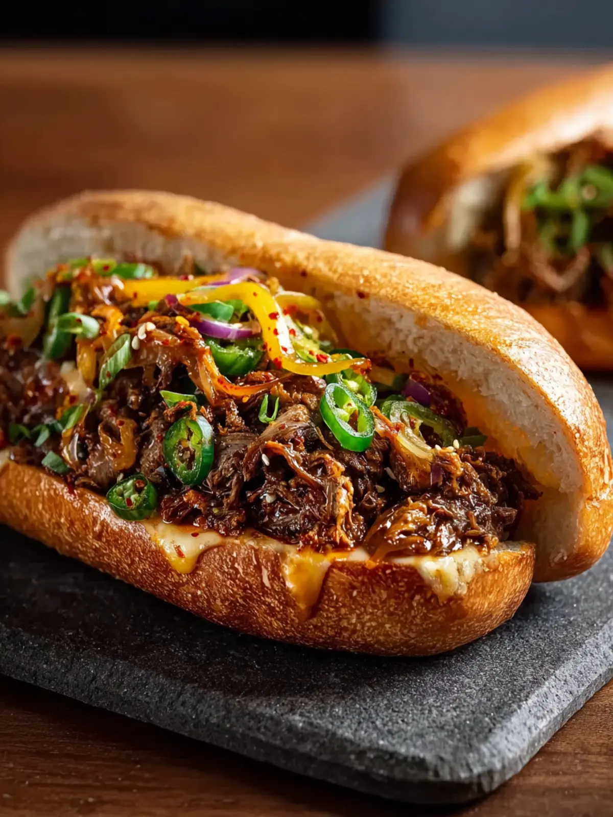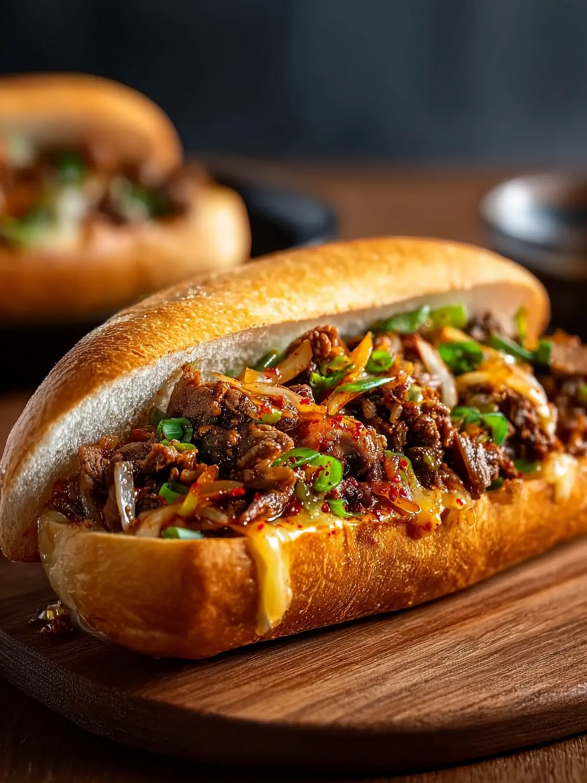 A delicious Korean-inspired cheesesteak with marinated beef, melty cheese, and tangy kimchi.