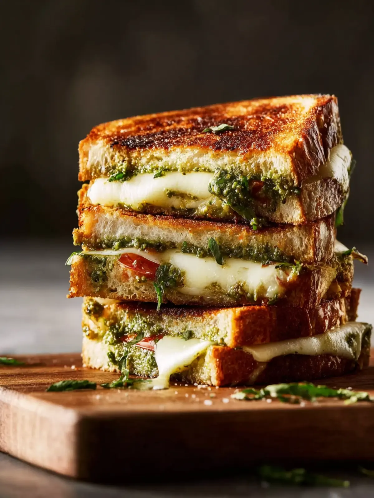 A delicious grilled sandwich featuring pesto, mozzarella, and cheddar.